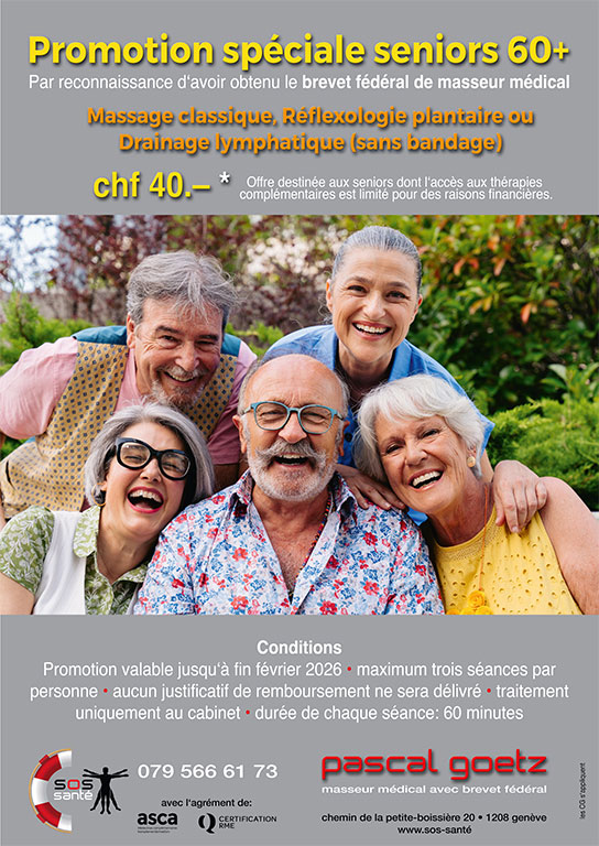 Aus Anlass des Diploms „Medizinischer Masseur mit eidgenössischem Fachausweis“ biete ich eine spezielle Promotion für Personen ab 60 Jahren an.